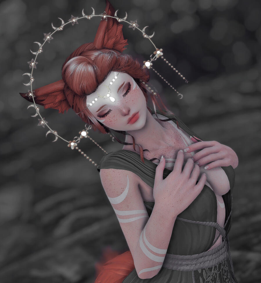 Wearing homemade clothes and hand-me-down boots, she's a child of the hinterlands. That dragon-infested wilderness is ground into her skin, seeped into every pore and freckle.From a clan that died at the hands of calamity, she's a lonely little thing, missing the bustle of family and the security of a lost mentor. There are bags beneath her eyes, and she'll confess that she doesn't sleep well... nightmare-plagued since the loss of her clan. But despite the melancholy in her eyes, she smiles and hums and sings through her work, as though she could manifest joy through her demeanor alone.Often Fiadh distracts herself with work; planting gardens, spinning wool, collecting herbs and concocting tinctures. She has a healer's bearing, a soft expression and nimble hands, with a home remedy for most ills and a spell for everything else. In quiet keeping with the ways of her clan, Fiadh offers her prayers to the Twelve and comports herself with humble wisdom. Her simple practice masks deep knowledge drawn from the buried libraries of New Sharlayan, and what looks like superstitious mysticism may be well-rooted in aetherological research.
